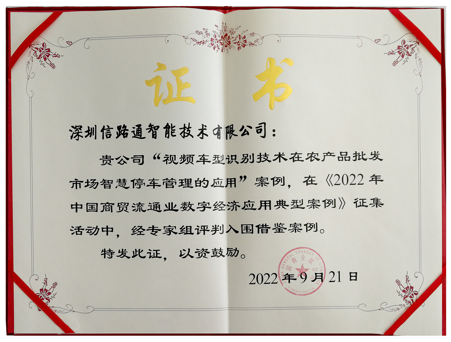 中國商業(yè)聯(lián)合會為切實貫徹國家促進(jìn)數(shù)字經(jīng)濟(jì)發(fā)展戰(zhàn)略規(guī)劃,挖掘商貿(mào)流通業(yè)中數(shù)字經(jīng)濟(jì)在新技術(shù)、新場景等方面的典型應(yīng)用做法,開展典型案例的評選活動,經(jīng)由行業(yè)專家、學(xué)者組成的專家組在創(chuàng)新性、可操行性、商業(yè)模式、技術(shù)含量、發(fā)展空間等五個方面的綜合研判,信路通“視頻車型識別技術(shù)在農(nóng)產(chǎn)品批發(fā)市場智慧停車管理的應(yīng)用”案例入選。
