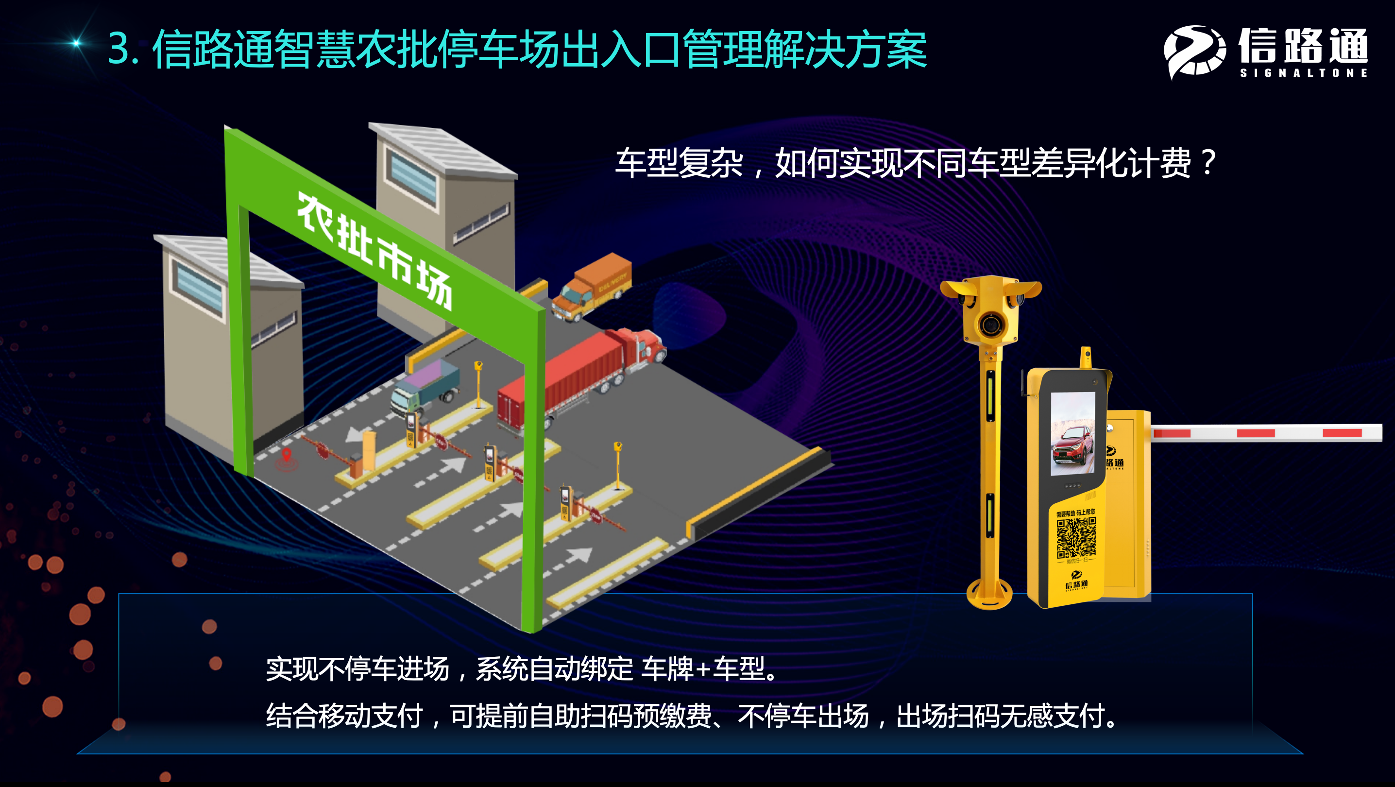 信路通車型識別停車管理系統,精準區分農批市場進出的復雜車輛類型,實現停車費用差異化計價,降低人力成本,減輕出口排隊堵塞,解決因進出車型復雜產生的主觀性、非主觀性收費漏洞、甩掛換掛等問題。
